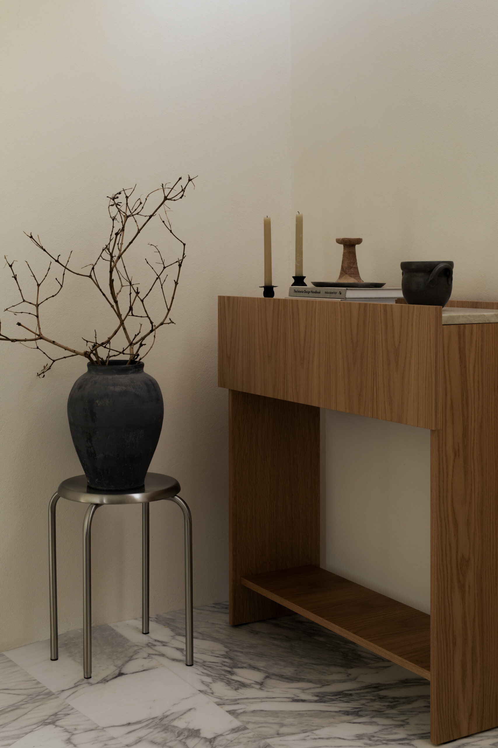 Exposed brick, natural stone, dark oak, steel, linen, and handmade ceramics.